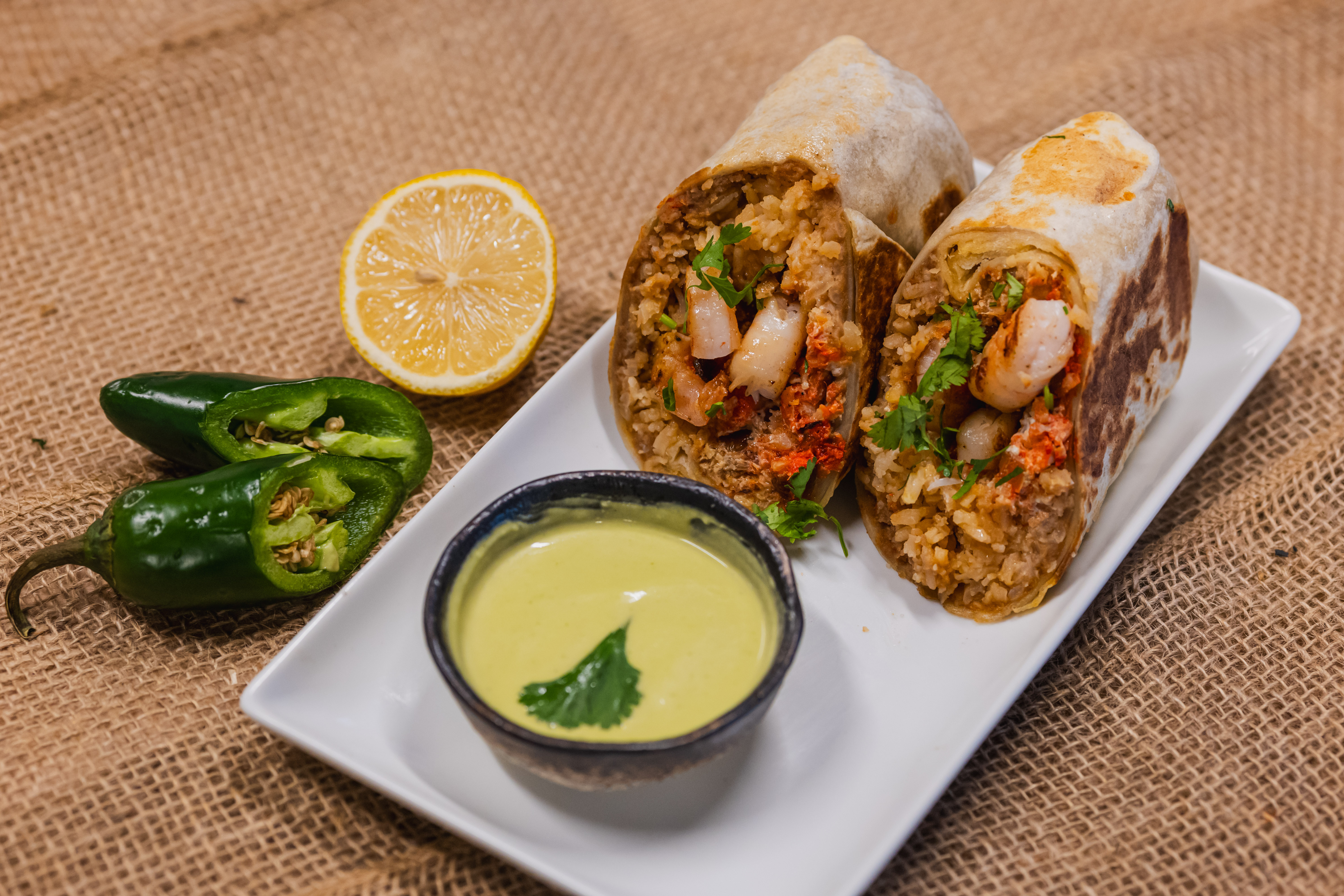 Refried beans, our shredded yam and potato mixed, corn salsa, pico de gallo salsa, guacamole, creamy jalapeño sauce, in a flour tortilla. if you want everything inside. Please let us know. Otherwise we put the jalapeño sauce on the top