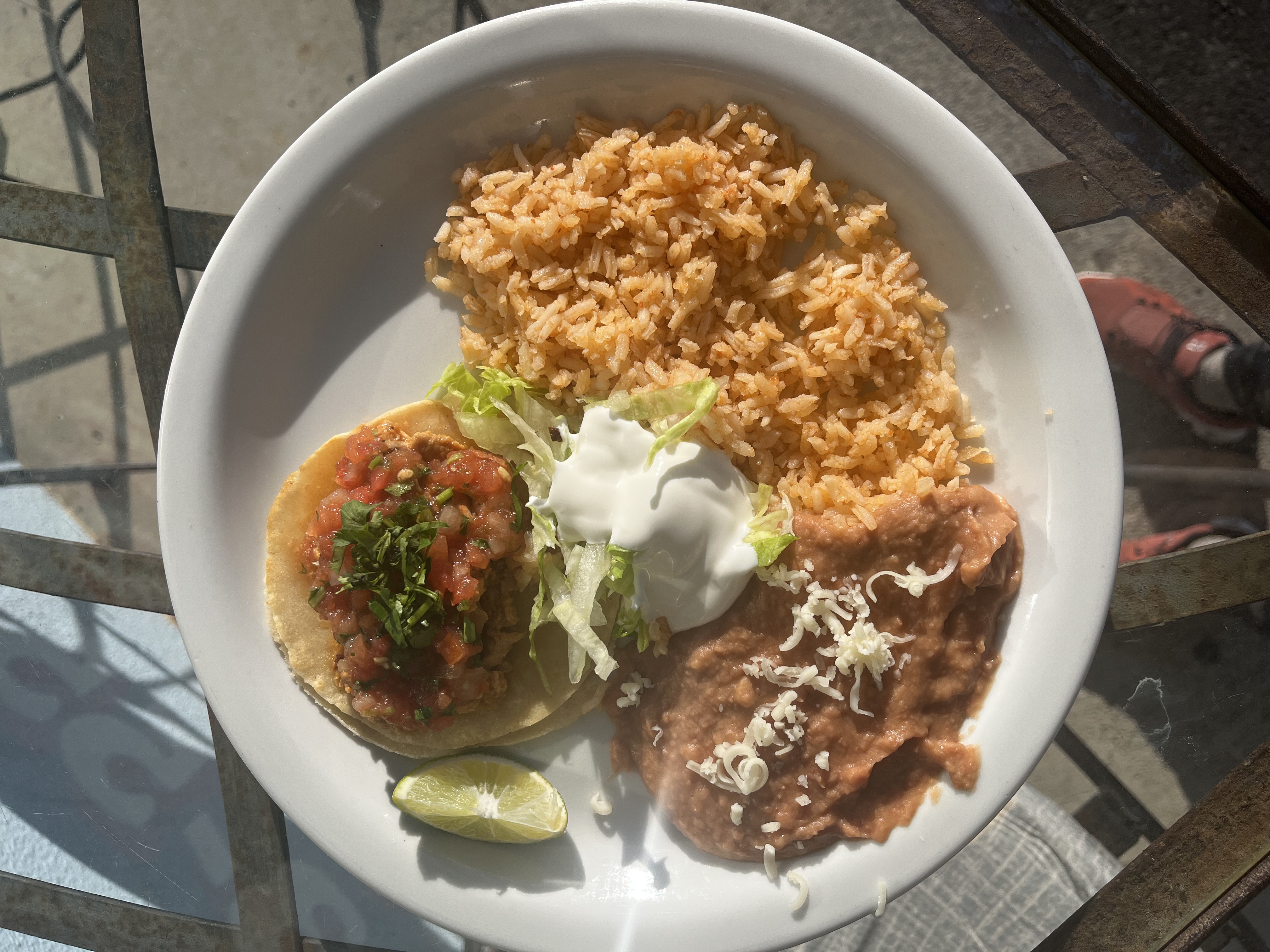 1 tofu taco, 1 papas taco, and 1 eggplant/bell pepper/garlic taco on GMO free corn tortillas and pico de gallo, Spanish rice, refried beans, lettuce and Guacamole