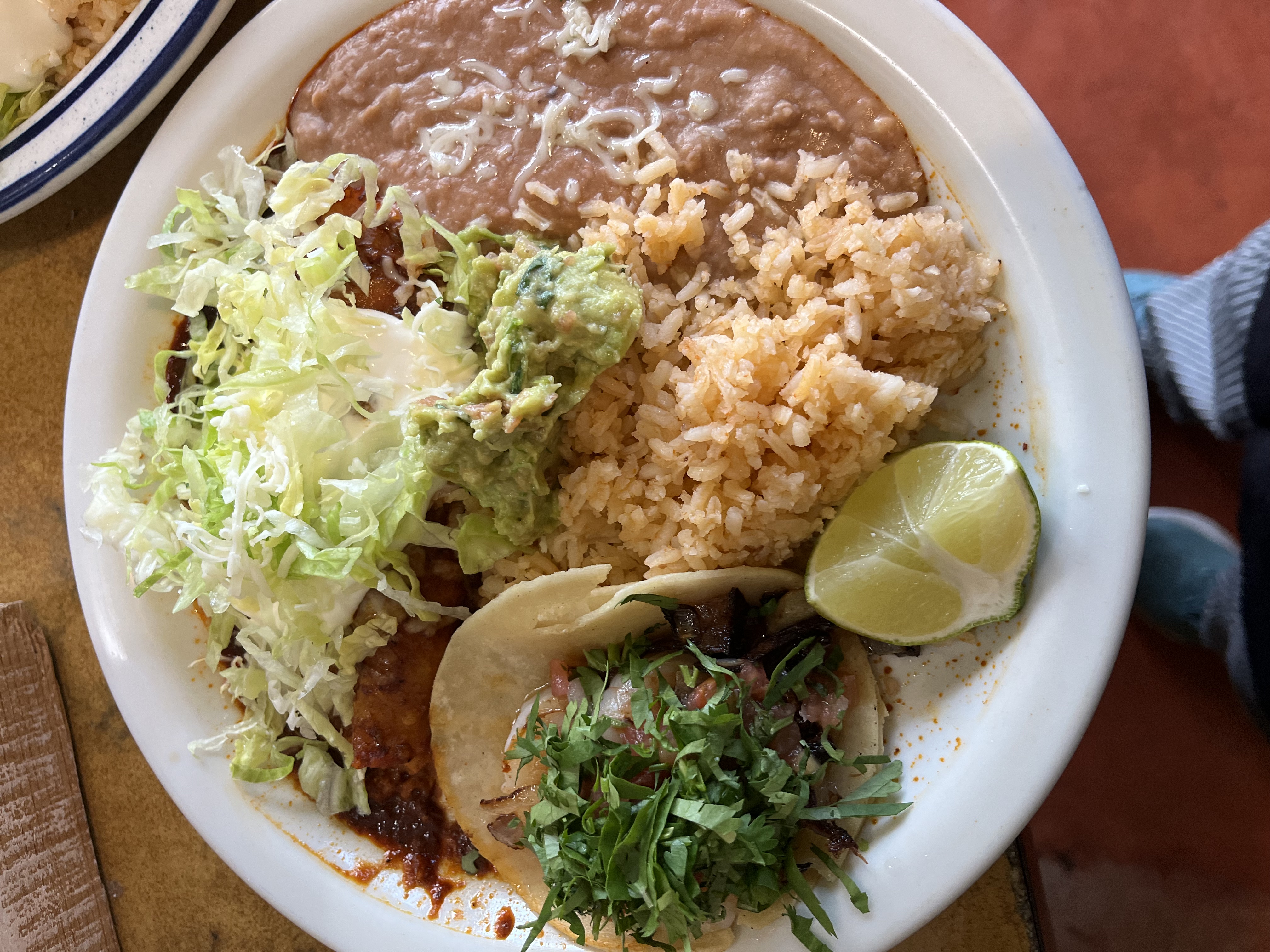 A plate with your choice of either a taco, enchilada or a tostada, served with Spanish rice, refried beans, side of lettuce, and sour cream