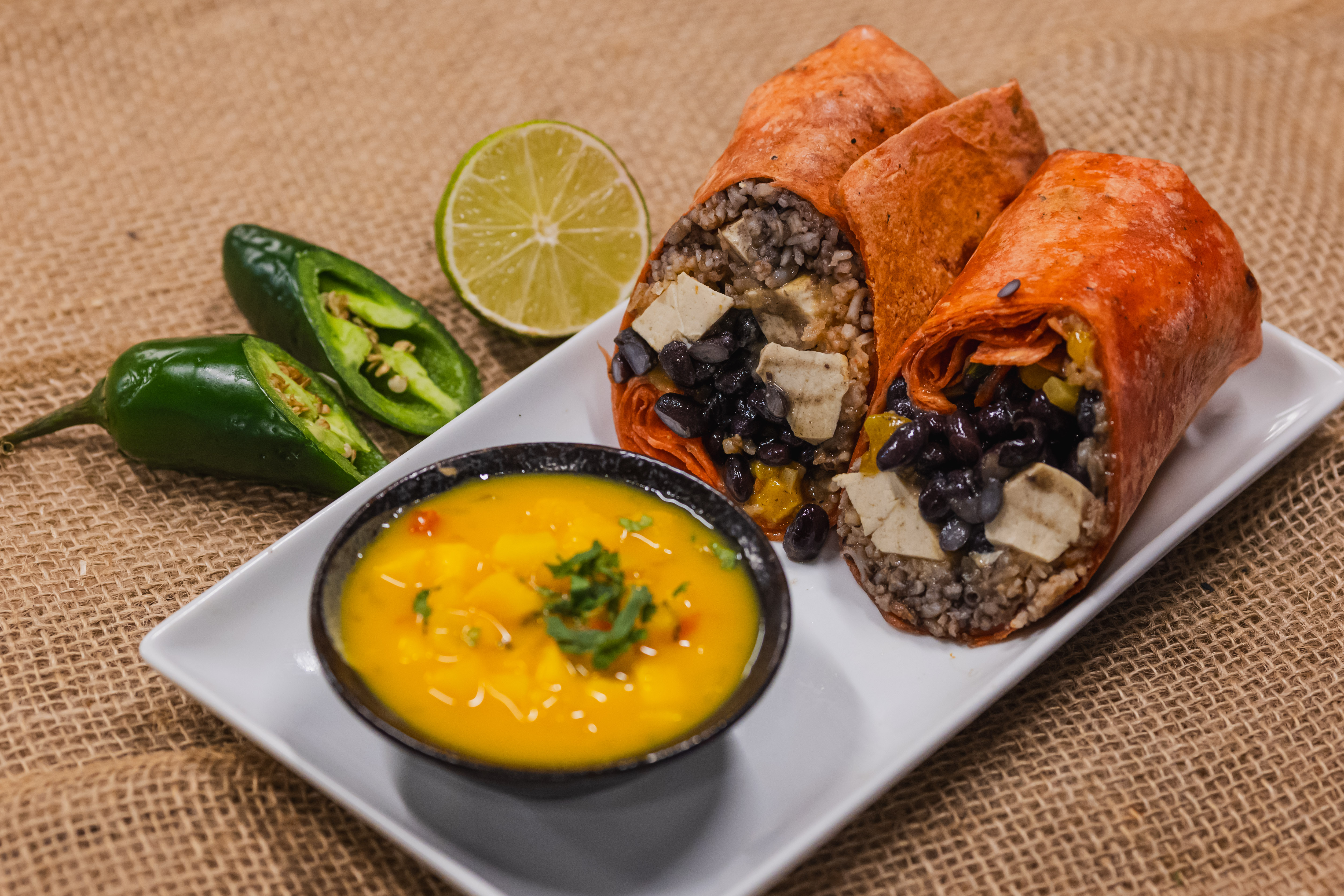 Black beans, Spanish rice, organic tofu in salsa Verde, mango salsa, in a roma tomato tortilla